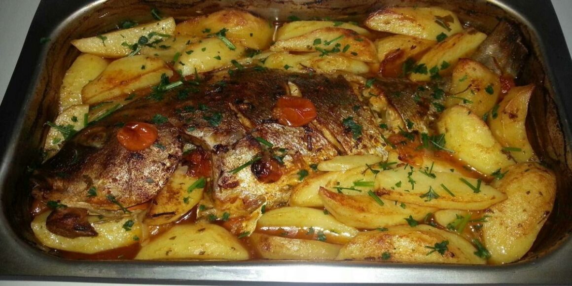 - Descasque as batatas e corte-as às rodelas bem grossas, passe-as por água e tempere-as com sal a seu gosto. De seguida coloque-as ao lado do peixe. Depois de as batatas estarem devidamente colocadas junto com o peixe regue com a cebolada e leve ao forno médio durante cerca de 20 a 40 minutos aproximadamente.